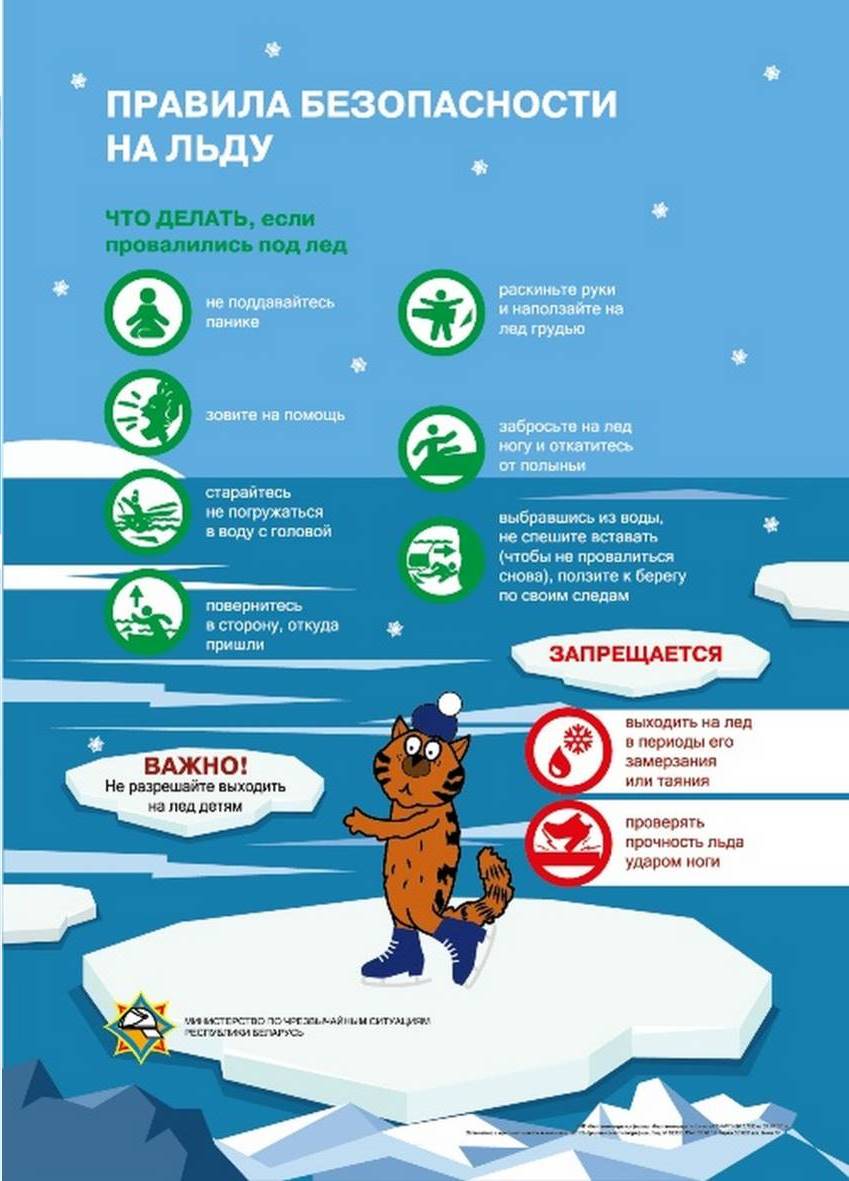 Не ходите по льду толпой или с тяжелым грузом. Лучше всего без необходимости не выходить на лед. В случае треска льда, появления воды на поверхности льда немедленно вернитесь на берег. Человек может погибнуть в результате переохлаждения через 15-20 минут после попадания в воду.
